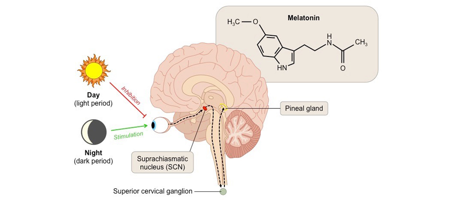 Paparan cahaya ke mata kita, menentukan berapa banyak melatonin yang disintesis dan dikeluarkan oleh pineal.
