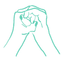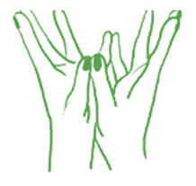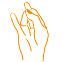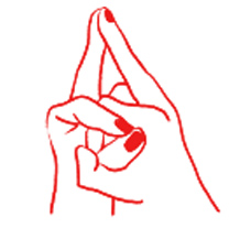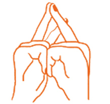 Tempatkan telapak tangan menghadap ke atas di paha. Sentuh ujung ibu jari, jari telunjuk, dan jari manis bersama, luruskan melalui jari kelingking dan jari tengah.
